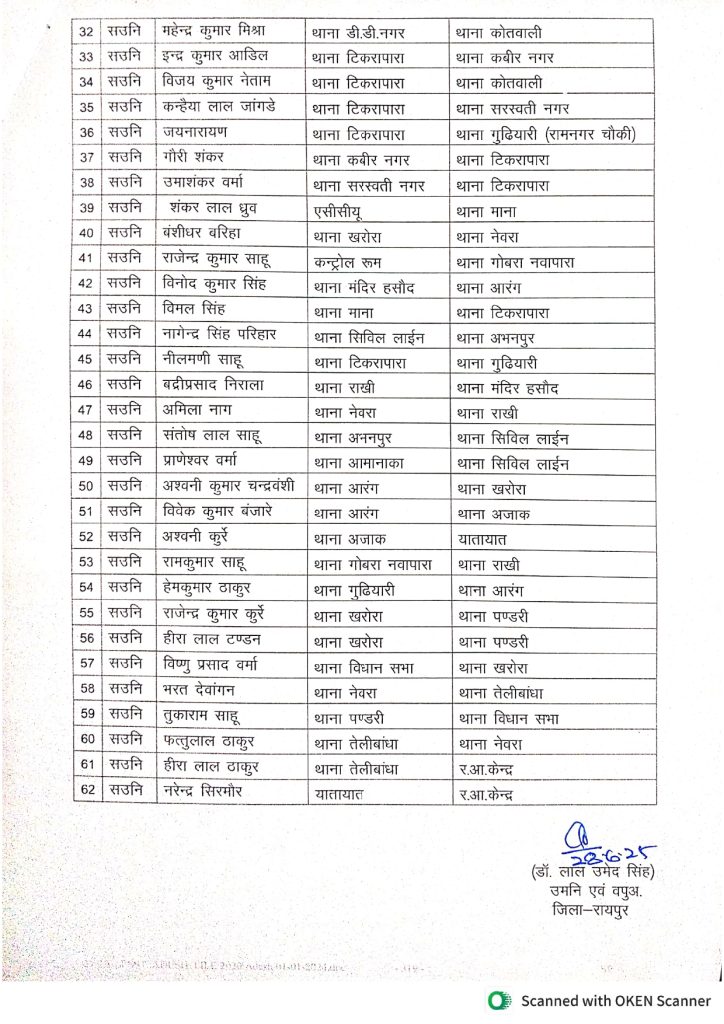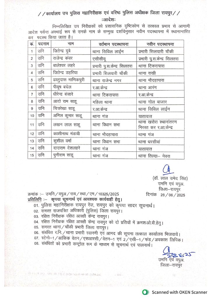 छत्तीसगढ़ की राजधानी रायपुर में पुलिस विभाग में एक बार फिर बड़ा प्रशासनिक फेरबदल हुआ है। रायपुर के वरिष्ठ पुलिस अधीक्षक (SSP) डॉ. लाल उमेद सिंह ने शनिवार को एक अहम आदेश जारी करते हुए 77 पुलिस अधिकारियों का तबादला किया है। इस सूची में सब इंस्पेक्टर (SI) और असिस्टेंट सब इंस्पेक्टर (ASI) स्तर के अधिकारी शामिल हैं।