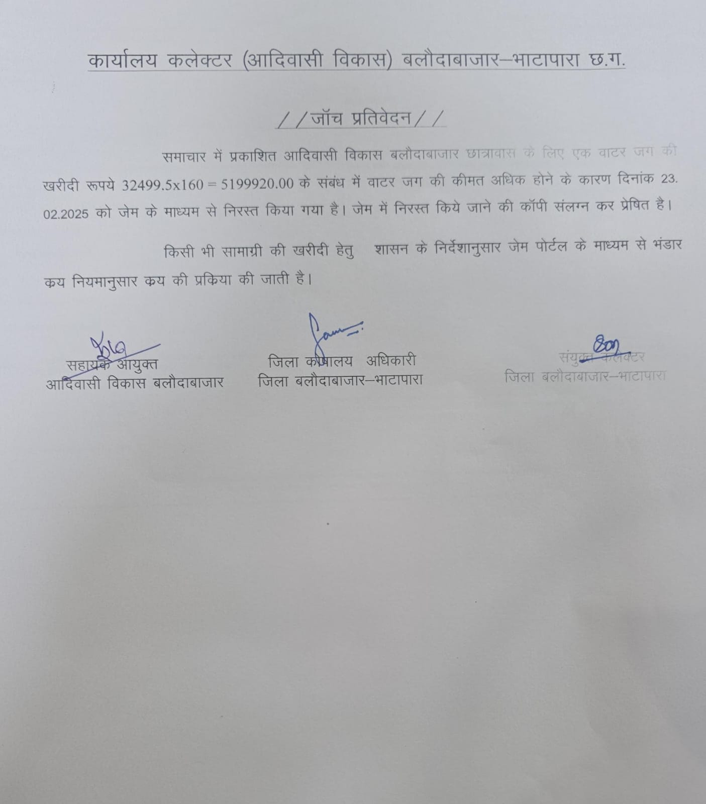 सहायक आयुक्त आदिवासी विकास सूरजदास मानिकपुरी ने बताया कि तत्कालीन सहायक आयुक्त संजय कुर्रे के द्वारा जिले के छात्रावासो के लिए जेम पोर्टल के माध्यम से 160 नग वाटर जग खरीदी हेतु प्रस्तावित किया गया था किन्तु दर अधिक होने के कारण विभाग द्वारा उक्त प्रस्ताव फ़रवरी 2025 में ही निरस्त कर दिया गया है । इससे स्पष्ट है कि आदिवासी विकास विकास विभाग बलौदाबाजार द्वारा उक्त वाटर जग क़ी खरीदी नहीं क़ी गई है। उन्होंने वाटर जग खरीदी सम्बंधित सोशल मीडिया में प्रसारित सामग्री क़ो भ्रामक बताते हुए असत्य बताया है।