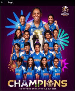 मुख्यमंत्री श्री साय ने भारतीय महिला क्रिकेट टीम की इस ऐतिहासिक उपलब्धि को “परिश्रम, आत्मविश्वास और संकल्प की जीत” बताते हुए कहा कि यह जीत देशभर में महिला खेल प्रतिभाओं को नई दिशा देगी।
