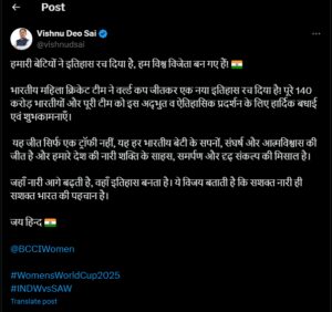 मुख्यमंत्री श्री साय ने कहा कि भारतीय महिला क्रिकेट टीम की जीत हर उस बेटी के लिए प्रेरणा है, जो अपने सपनों को साकार करने का साहस रखती है।