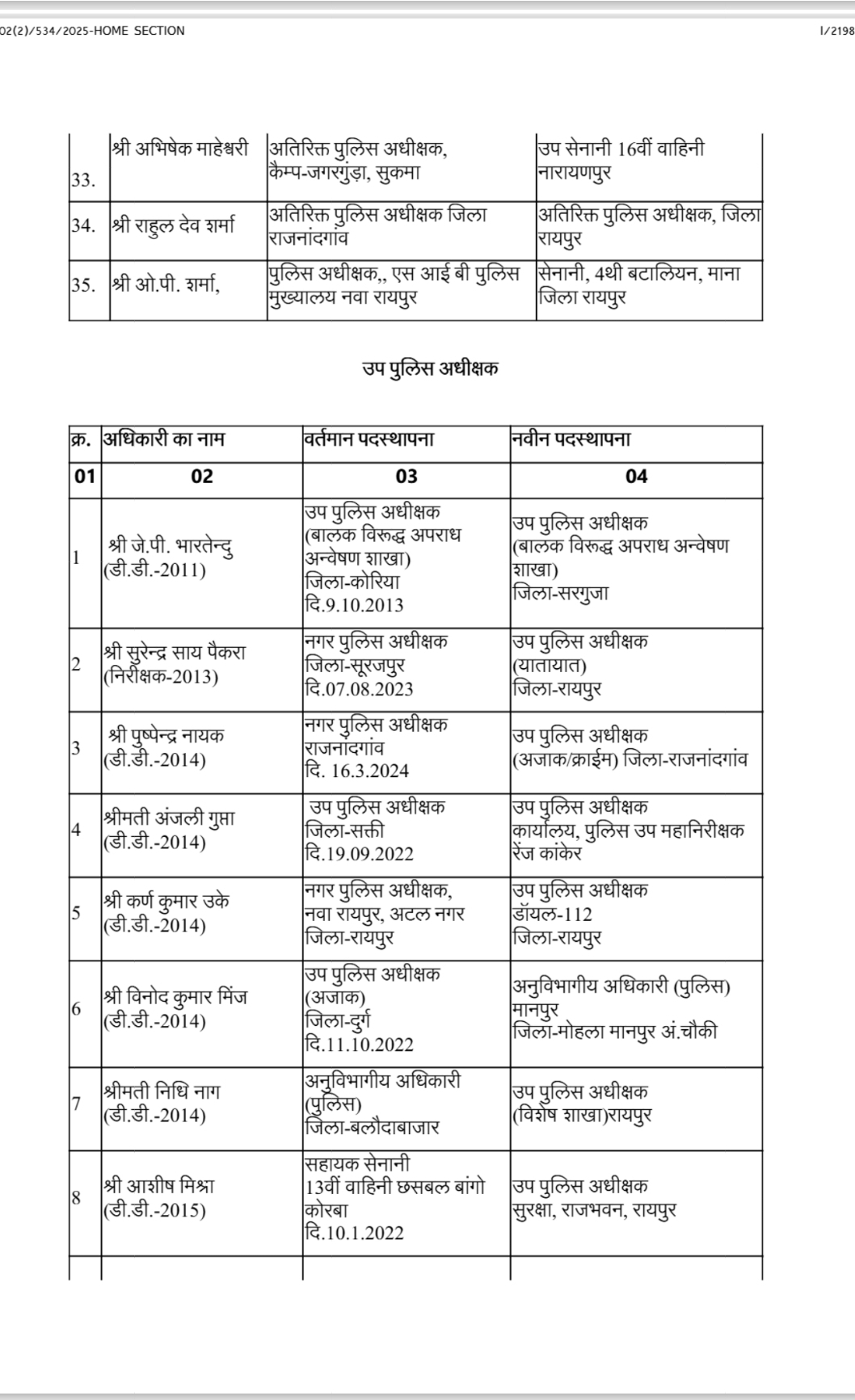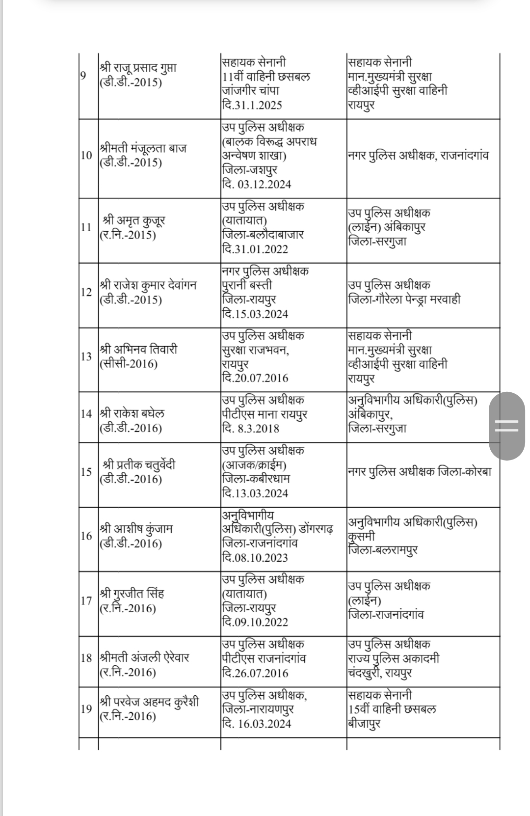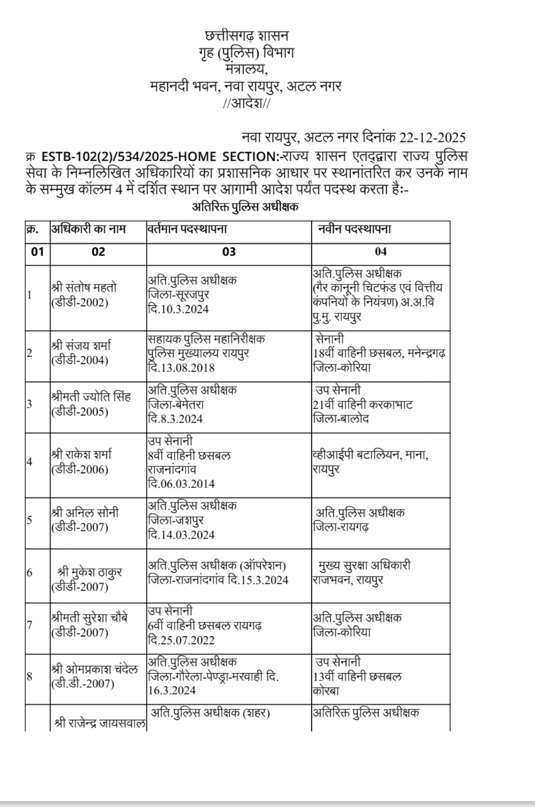 जारी आदेश के अनुसार, रायपुर ग्रामीण के अतिरिक्त पुलिस अधीक्षक कीर्तन राठौर को राजनांदगांव जिले का प्रभार सौंपा गया है। वहीं एएसपी राहुल देव शर्मा को रायपुर ग्रामीण का नया अतिरिक्त पुलिस अधीक्षक नियुक्त किया गया है।
