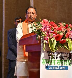 रायपुर 24 जनवरी 2026 : मुख्यमंत्री श्री विष्णुदेव साय आज राजधानी रायपुर के पंडित दीनदयाल उपाध्याय ऑडिटोरियम में राष्ट्रीय सड़क सुरक्षा माह-2026 के अंतर्गत आयोजित राज्य स्तरीय सड़क सुरक्षा सम्मान समारोह में शामिल हुए। इस अवसर पर मुख्यमंत्री श्री साय ने कहा कि जन जागरूकता से सड़क दुर्घटनाओं में कमी आएगी। यातायात नियमों के प्रति सजगता ही हमें जनहानि से बचा सकती है।
