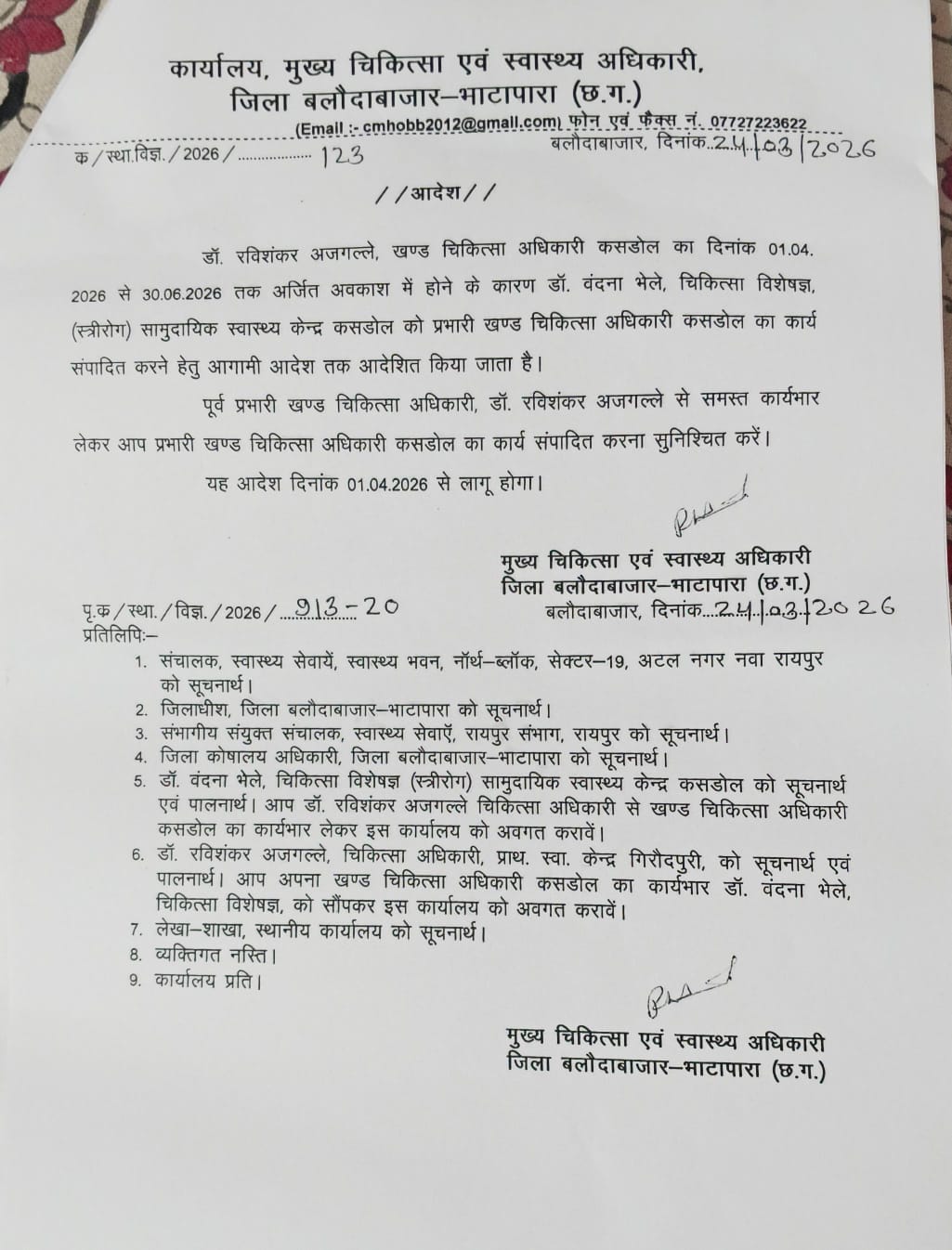 बलौदाबाजार-भाटापारा। मुख्य चिकित्सा एवं स्वास्थ्य अधिकारी (CMHO) जिला बलौदाबाजार-भाटापारा द्वारा जारी आदेश के अनुसार कसडोल में खंड चिकित्सा अधिकारी के पद पर अस्थायी प्रभार परिवर्तन किया गया है।
